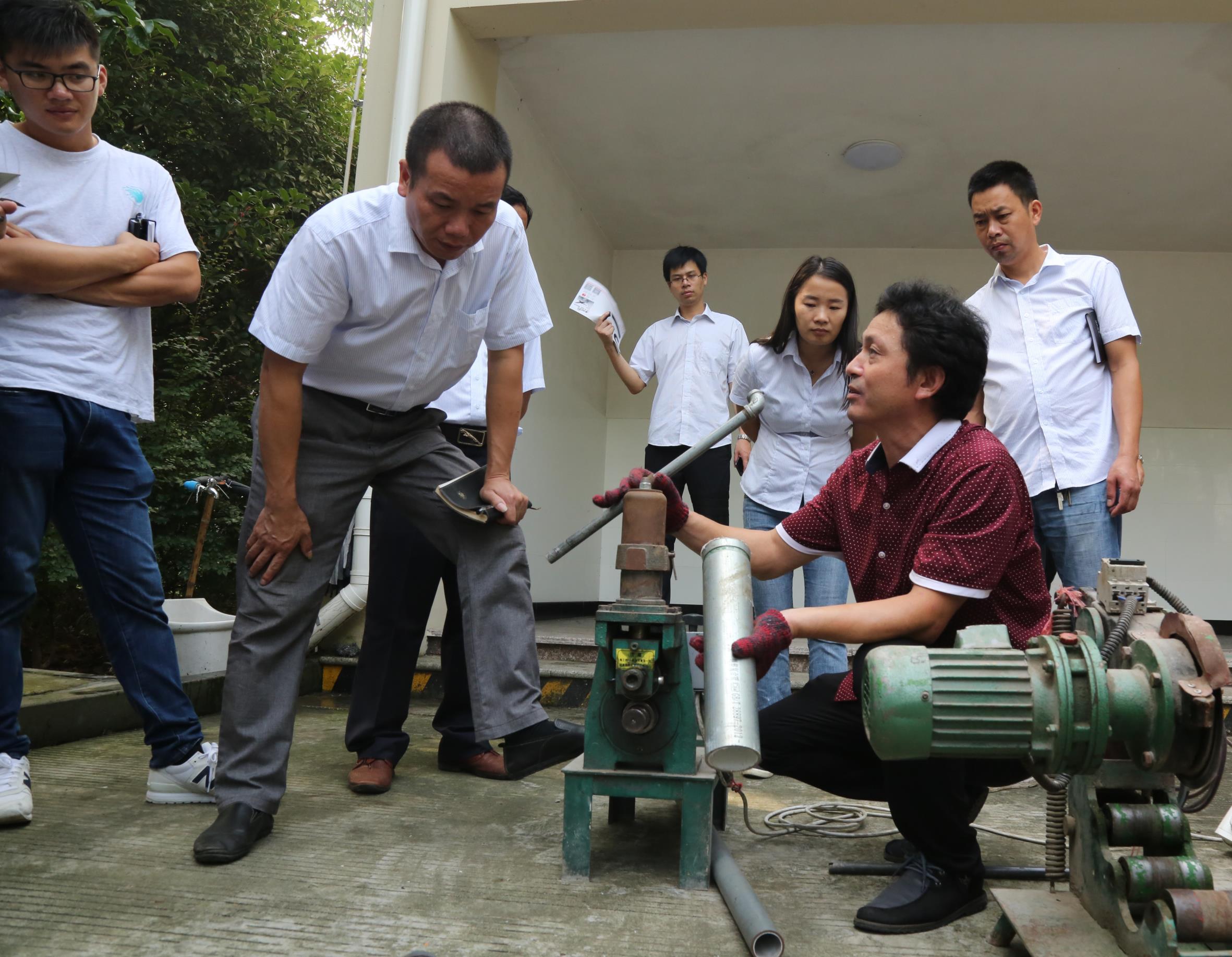 培训主要围绕钢塑管开槽施工操作、配件和钢塑管的连接工艺展拉开,厂方技术人员示范操作结束后,还让每位在场受训人员对不同口径的钢塑管开槽与连接进行了模拟操作。
